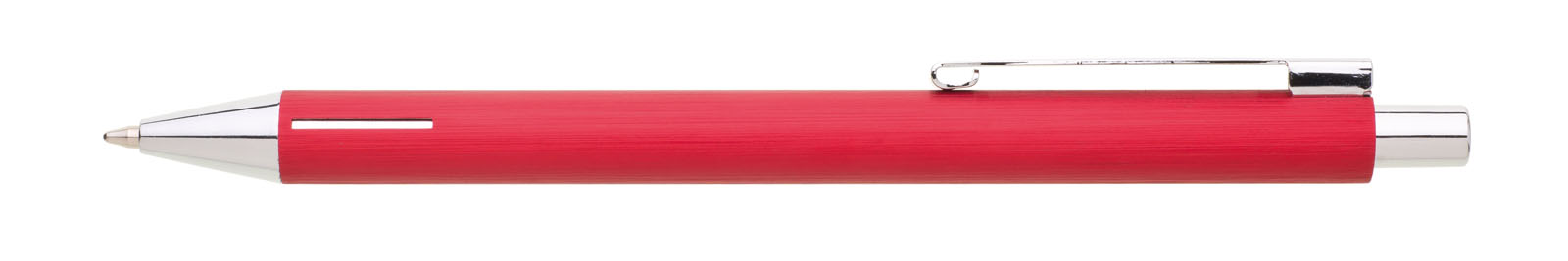 Elegantní hliníková propiska s jemně rýhovaným, červeným povrchem a stříbrnými doplňky.