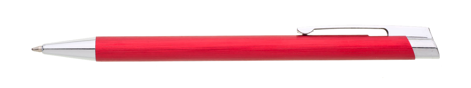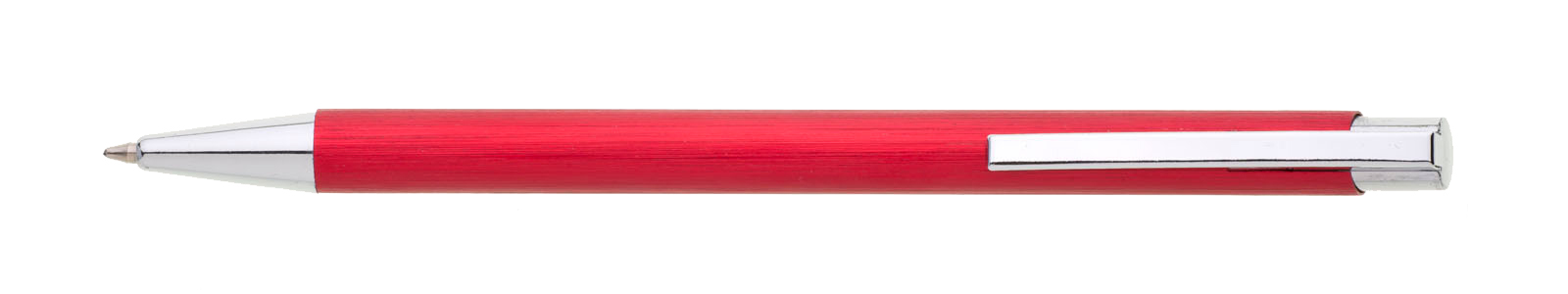 Červená kovová propiska s jemně rýhovaným povrchem.