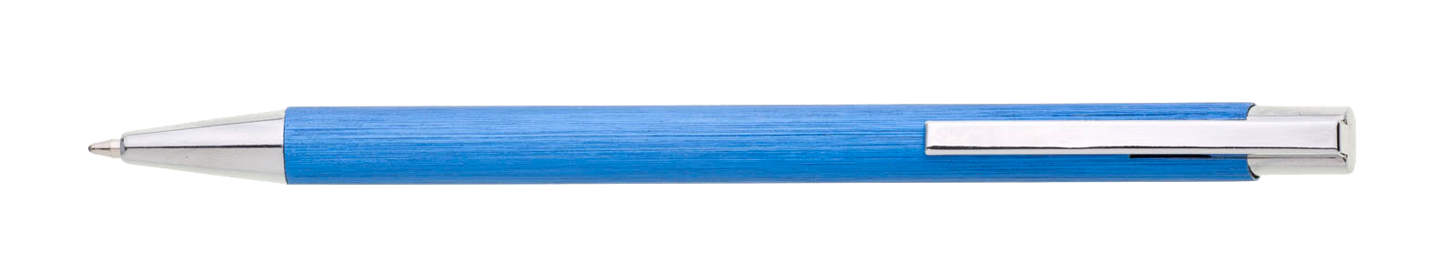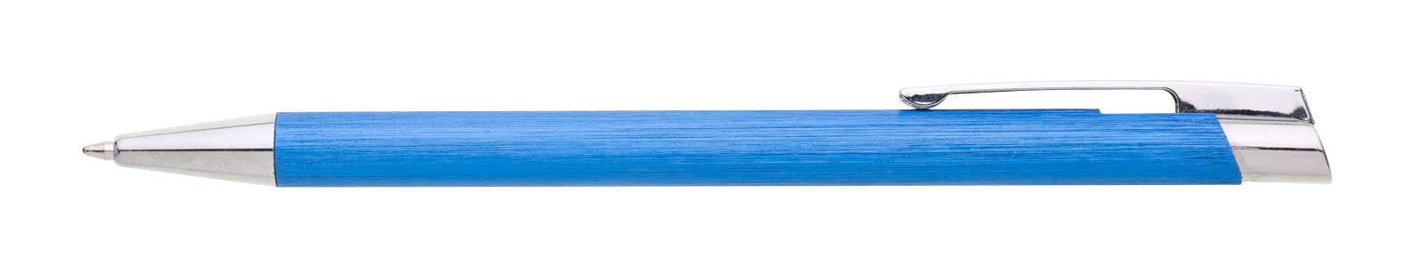 Modrá kovová propiska s jemně rýhovaným povrchem.