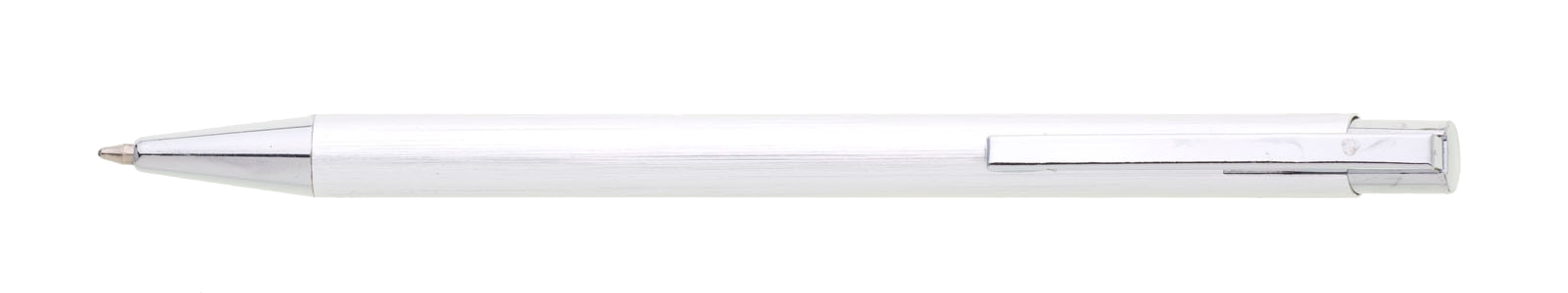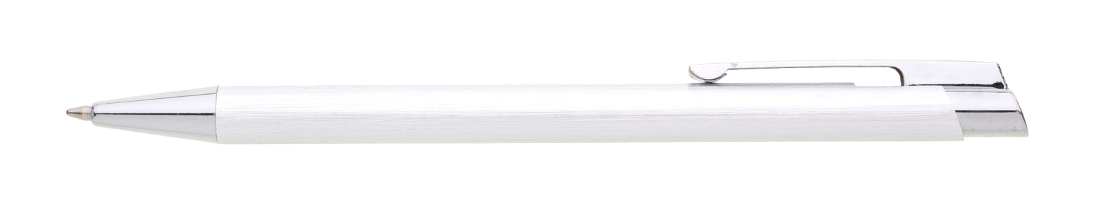Stříbrná kovová propiska s jemně rýhovaným povrchem.