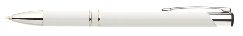 Plastové propisovací pero OIRA - bílé. Pero je zdobené dvěma stříbrnými proužky. Na těle je zdobeno oválným výřezem. Pero má náplň velkoobsahovou, modře píšící.