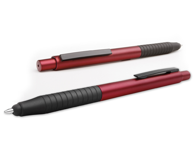 Plastová propiska s bílým tělem s červeným úchopem a klipem a stříbrnými doplňky.