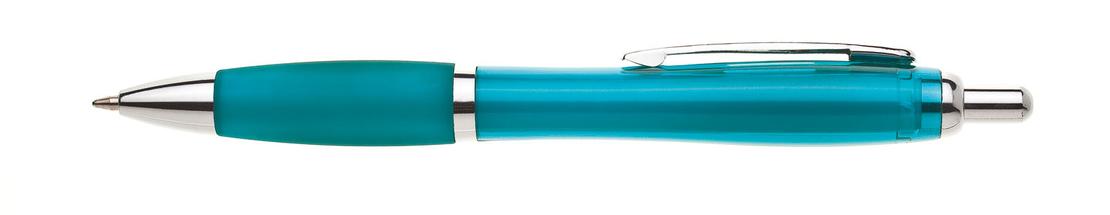 Oblíbené plastové propisovací pero ULTA s celobarevným, transparentním, tyrkysovým tělem. Barva pogumovaného úchopu je stejná jako tělo. Pero je zdobené stříbrným proužkem, ostatní doplňky jsou také stříbrné. Náplň je velkoobsahová, modře píšící. Kolekce