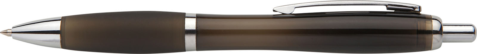 Oblíbené plastové propisovací pero ULTA s celobarevným, transparentním, černým tělem. Barva pogumovaného úchopu je stejná jako tělo. Pero je zdobené stříbrným proužkem, ostatní doplňky jsou také stříbrné. Náplň je velkoobsahová, modře píšící. Kolekce EVER