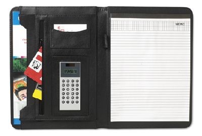 Konferenční desky A4, s linkovaným blokem a kalkulačkou, 3 přihrádky, poutko na pero, imitace kůže /ABS/ PVC. Rozměry: 33,5 × 24,5 × 3 cm. Cena nezahrnuje recyklační poplatek. Poznámka: Dodáváme včetně baterie, bez dekorace.