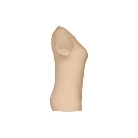 Dámské žerzejové tričko přiléhavého střihu ze 100% bavlny (190 g/m²). Barva 83: 90% bavlna a 10% viskóza. Tenký žerzejový límec se saténovým žebrováním. Dvojité prošití na rukávech a spodním lemu. Šité po stranách. Velikosti: S, M, L, XL, XXL