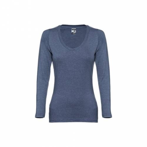 BUCHAREST WOMEN. Dámské bavlněné tričko s dlouhým rukávem a páskem, modrý melír, XXL