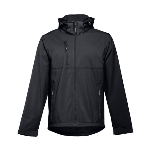 Pánská softshellová bunda s odnímatelnou kapucí, 96% polyester a 4% elastan (280 g/m²). Vodoodpudivý povrch (třída III). Podšívka ze síťoviny z materiálu polar. 2 přední kapsy na zip. Diagonální náprsní kapsa na zip. Nastavitelné manžety s páskem na suchý zip. Odnímatelná kapuce se stahovací šňůrkou a páskem na suchý zip pro upevnění k límci. Zaoblený dolní okraj zadního dílu.Velikosti: S, M, L, XL, XXL