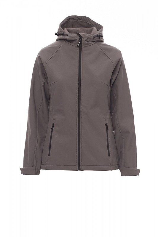 Dámská softshellová bunda, nepromokavá, větruvzdorná, raglánové rukávy, kapuce se šňůrkami ke stažení, dvě vnější kapsy na zip. Zapínání na zip, suchý zip u krku. Výška vodního sloupce 8 000 mm, prodyšnost 3 000 mvp. Materiál 100% polyester, shoft-shell, 320 g/m2.