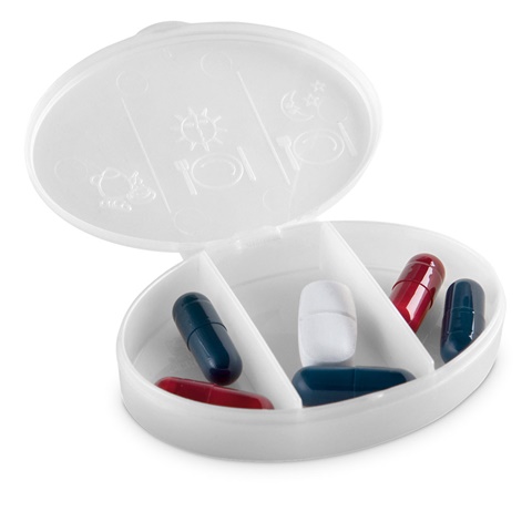 PP oválná krabička na léky se 3 přihrádkami. Na vnitřní straně víka jsou obrázky s motivy snídaně, obědu a večeře, které umožňují každodenní organizaci.70 x 50 x 15 mm Bezpečné pro potraviny, Vyrobeno v EU, BPA free