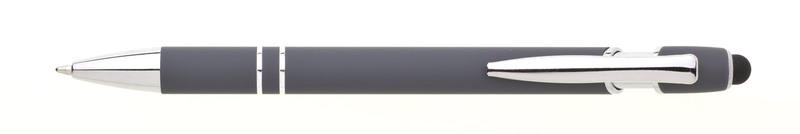 Propiska s touch koncem, měkkým pogumovaným soft povrchem v šedé barvě a stříbrnými doplňky včetně dvou ozdobných kroužků.