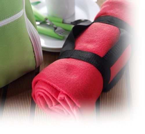 Fleecová deka s nylonovým popruhem vhodným pro tisk, 100% polyester (170–180 g/m2). Rozměry: v rozloženém stavu 162 × 125 cm, ve složeném stavu 30 × 14 × 12 cm.