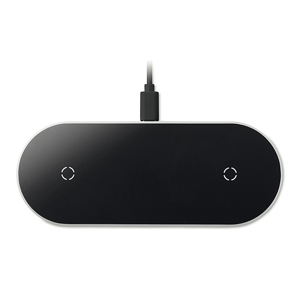 Bezdrátové nabíjení pro dva telefony. Možnost podsvícení loga při vylaserování. Výstup DC5V/1.0A. Kompatibilní s nejnovějšími androidy, iPhone® 8, 8S, X a novější. Rozměry: 6,1 x 15,5 x 1 cm. Doporučená technologie tisku: Tampontisk T3. Kartonové množství v ks: 200