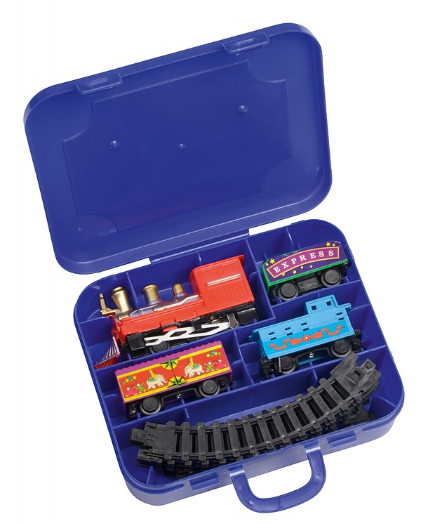 Elektrická hračka lokomotiva s vagónky v kufříku nejen pro děti. Kufřík obsahuje: 1 elektrická lokomotiva, 3 různé železniční vozy, 6 přímých kolejnic, 6 zakřivených kolejnic. Napájeno 1 x baterií AA ( nejsou součástí), vypínač zapnuto / vypnuto. Rozměry: 15,5 x 3,5 x 12,5 cm Materiál: Plast. Doporučená technologie tisku: tampontisk T3. Kartonové množství v ks: 48