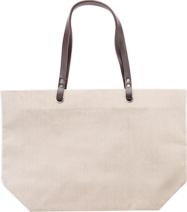 Lněná plážová nebo nákupní taška s PE rukojeťmi. Gramáž 260 g/m2. Rozměry: 32 × 40 × 14 cm.
