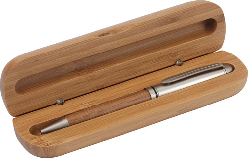 Kuličkové pero z bambusu v kombinaci s kovem. Je umístěno v dřevěném pouzdře. Modrá náplň. Rozměr: 16,2 x 4,5 x 2,4 cm. Doporučená technologie tisku: tampontisk T2, laser L1 a L2.