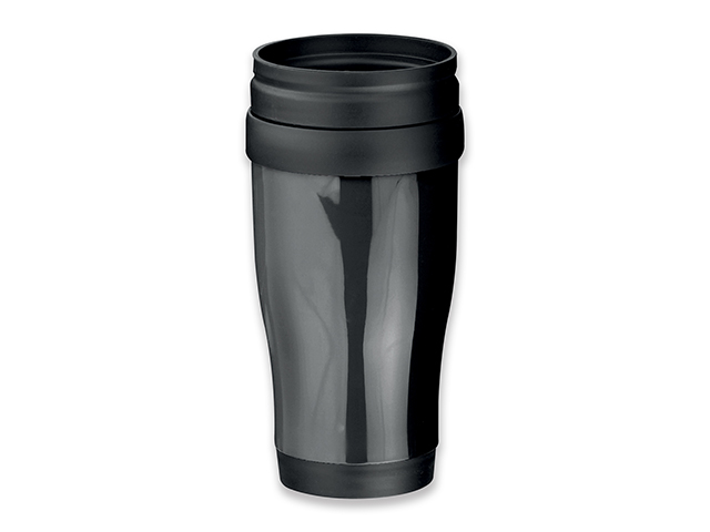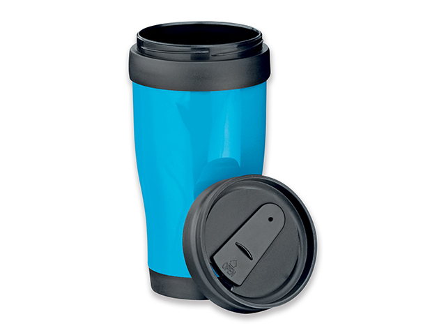 Plastový hrnek o objemu 350 ml s barevným silikonovým páskem a víčkem. Doporučená technologie tisku: tampontisk T3, laser L2. Maximální velikost tisku: 30 × 10 mm. Rozměry: O 9,2 × 11,2 cm. Kartonové množství v ks: 72.