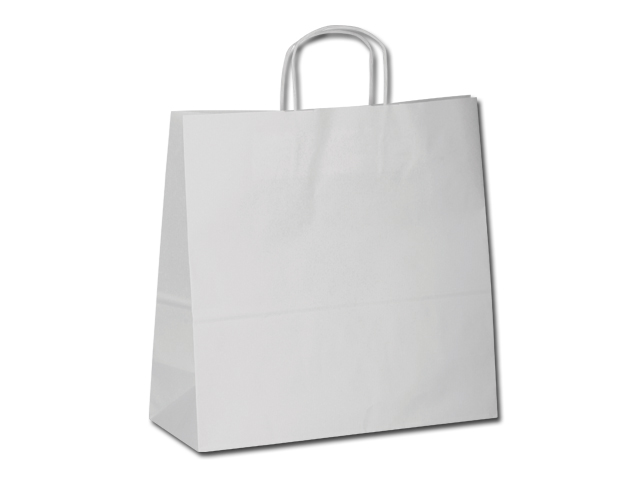 Papírová taška s celoplošným modrým potiskem na křídovém papíře s textilními držadly a lesklým povrchem. Rozměry: 24 × 10 × 27,5 cm.