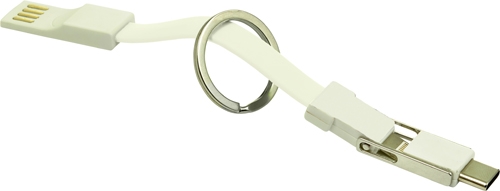 Plastový kabel se standardním USB, USB-C a Lightning konektorem. Kabel obsahuje magnet, který ho drží ve složeném stavu. Jeho součástí je kroužek na klíče. Délka kabelu cca 11 cm. Doporučená technologie tisku: tampontisk T3. Maximální velikost tisku: 10 x 5 mm. Rozměry: 13 x 1 x 0,5 cm. Kartonové množství: 200