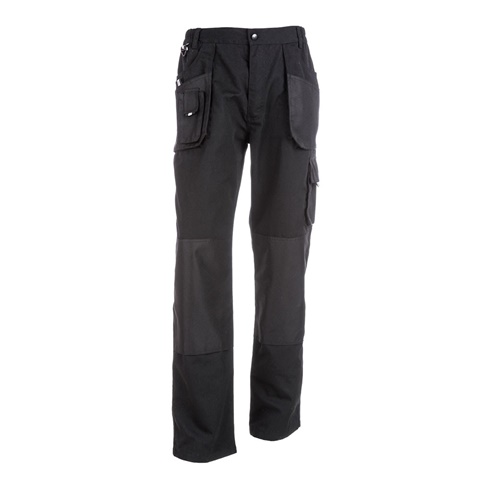 Unisexové kalhoty s elastickými pásky na bocích a poutka v pase. Zapínání na plastový zip s kovovým knoflíkem. Kalhoty mají dvě přední kapsy klasického střihu, jednu postranní kapsu se zapínáním, jednu kapsu na svinovací metr, dvě postranní kapsy, z nichž jedna otevřená a druhá s klopou na suchý zip, kontrastní vsadky a prošití, reflexní pruhy na zadní kapse, trojí prošití. Kalhoty jsou ušity ze 100% bavlny, 260g. Velikosti: XS–5XL