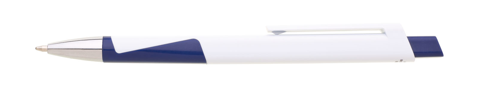 Plastová bílá propiska CARRE se čtvercovým profilem a modrýmii doplňky. Ideální na uv potisk. Náplň velkoobsahová, modře píšící.