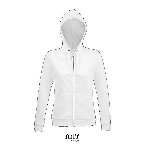 Dámská mikina SOLS s kapucí a celopropínacím zipem. Vnější strana mikiny je 100% bavlna 280 g a vnitřní strana je hladký fleece – 80% žebrovaná bavlna a 20% polyester. Mikina má dvě přední kapsy, podšité švy na krku a ve stejném tónu šňůrky u kapuce. Kartonové množství: 25