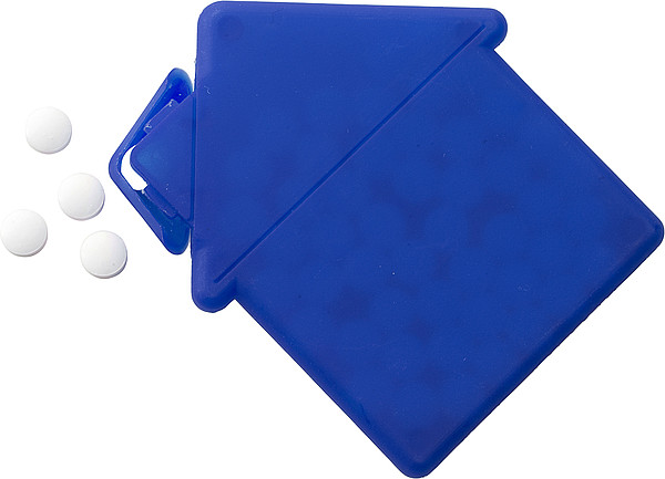 Mentolové bonbony bez cukru v plastovém obalu ve tvaru domečku. Obsah 6,5 g. Materiál polypropylen. Rozměry: 7,3 × 6,3 × 0,6 cm.