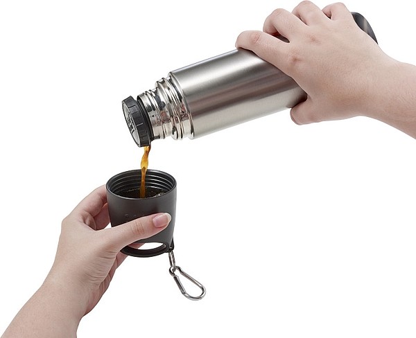 Nerezová dvoustěnná termoska s karabinou. Termoska má objem 500 ml. Plastové víčko slouží i jako hrníček na pití. Doporučená technologie tisku: laser L1. Maximální velikost tisku: 30 × 50 mm. Rozměry: O 7,3 × 32,5 cm. Kartonové množství v ks: 24.