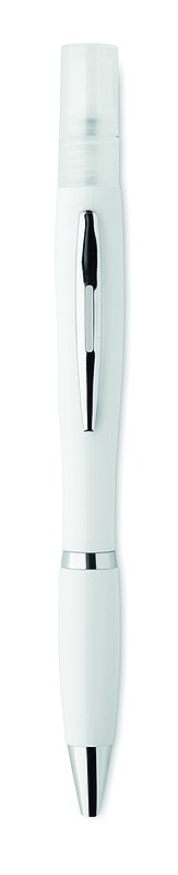 Plastové kuličkové pero s antibakteriálním povrchem a rozprašovačem. Rozprašovač lze naplnit tekutinou pro dezinfekci rukou nebo povrchu. Splňuje ISO 22196 (antimikrobiální účinnost). Pero má modrou náplň. Dezinfekce není součástí dodávky. Materiál plast ABS. Rozměry: O 1,4 × 15,9 cm.