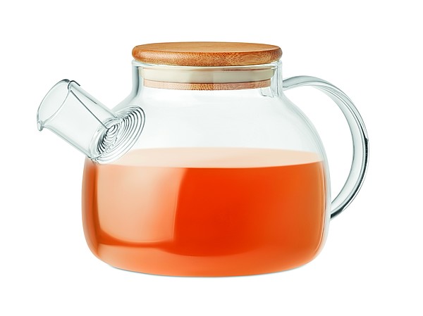Konvice na čaj z borosilikátového skla s nerezovým sítkem a bambusovým víčkem. Borosilákotové sklo je odolnější proti nárazům a teplotám více než běžné sklo a je vhodné na studené i horké nápoje. Objem 850 ml. Rozměry: 19 × 13 × 11 cm.