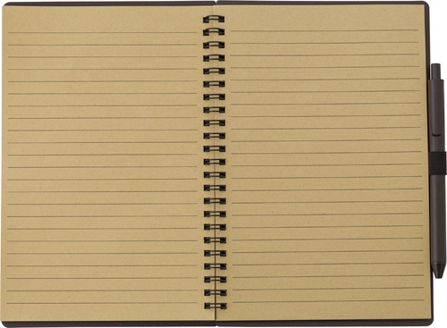 Poznámkový blok A5 s obalem z kávové sedliny. Pero z kávové sedliny s modrým inkoustem. Blok má 70 linkovaných listů kraftového papíru. Doporučená technologie tisku: tampontisk T3. Maximální velikost tisku: 35 × 50 mm. Rozměry: 21,2 x 14,5 x 1 cm. Kartonové množství v ks: 50.