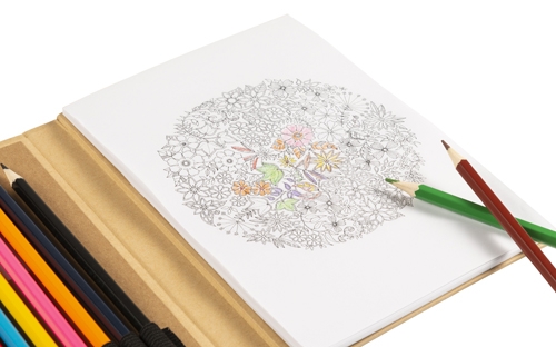 Sada 12 ks pastelek s 10 omalovánkami a 40 stranami čistého papíru v kartonové složce. Doporučená technologie tisku: tampontisk T2. Maximální velikost tisku: 50 x 40 mm. Rozměry: 21 x 15 x 2,5 cm. Kartonové množství: 40