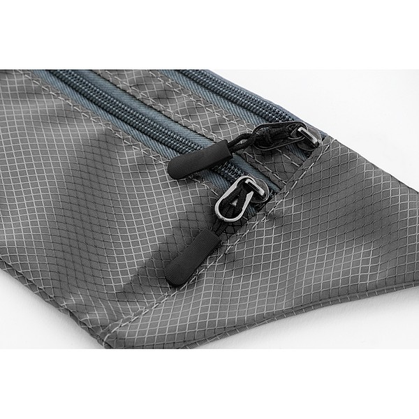 Sportovní ledvinka ze žakárového polyesteru s dvěma kapsami na zip na přední straně a jednou kapsou na zip na zadní straně. Nastavitelný popruh. Rozměry: 31 x 11,5 cm.