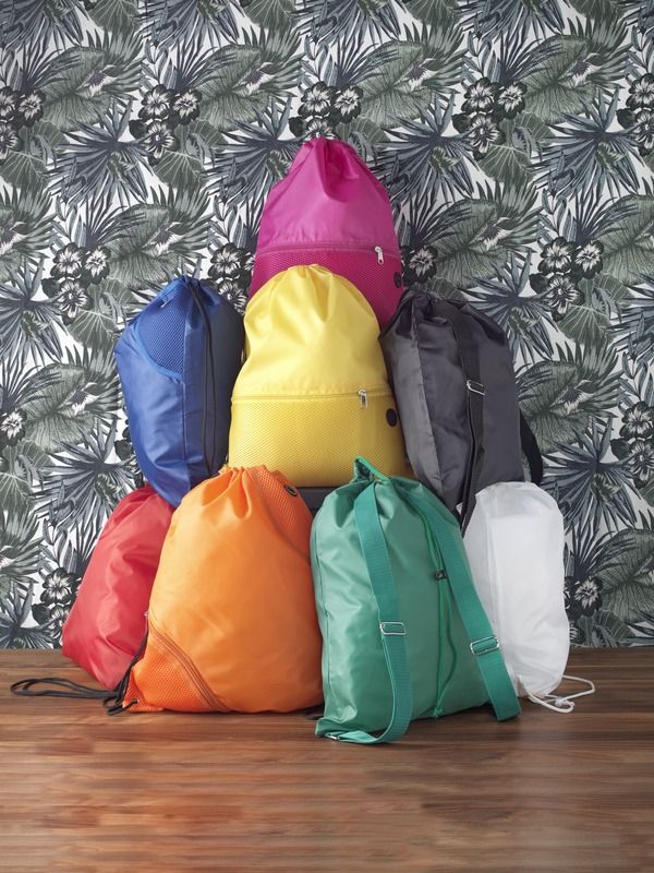 Stahovací batoh s ramenními popruhy. Batoh se zatahuje šňůrkou ve stejné barvě a má nastavitelné široké popruhy, čímž zajišťuje vyšší pohodlí při nošení. Nosnost do 5 kg. Materiál 210D polyester. Doporučená technologie tisku: sítotisk S1. Maximální velikost tisku: 320 x 230 mm. Rozměry: 33 × 42 cm. Kartonové množství v ks: 300.