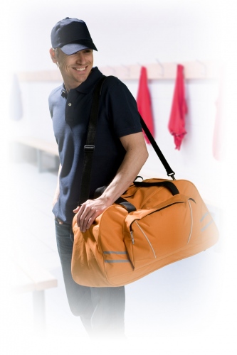 Sportovní taška na zip s velkou přední kapsou, reflexními proužky a nastavitelným ramenním popruhem. Materiál 600D polyester. Rozměry: 60 × 26 × 32,5 cm.
