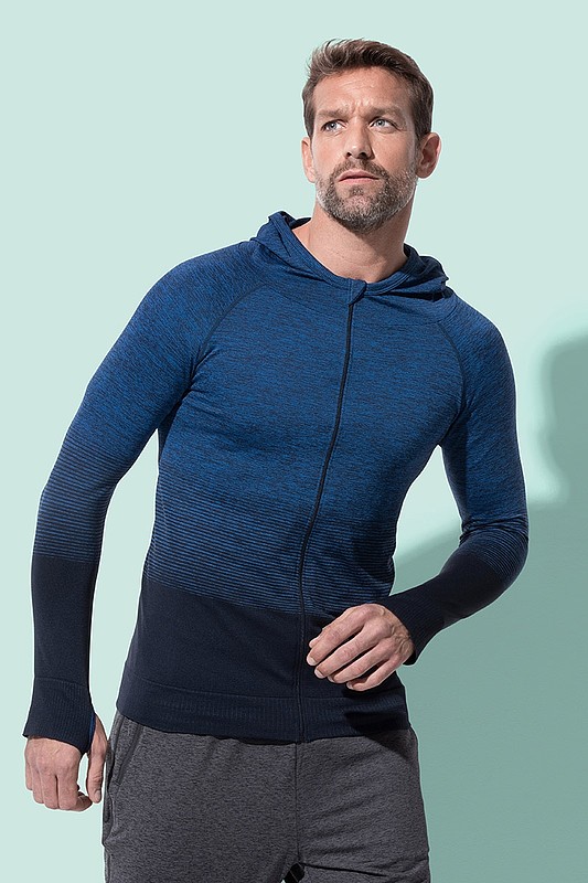 Pánská sportovní bunda s kapucí, stupňující se dvoubarevný vzor, raglánové rukávy s otvorem na provlečení palce, dekorativní bezešvé lemování na rukávech a spodním lemu. Zapínání na zip s kovovým jezdcem bez obsahu niklu. Materiál 75% nylon a 25% ACTIVE-DRY° polyester, 180 g/m2.