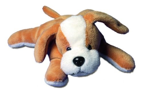 Plyšový pes s papírovou visačkou pro potisk. Rozměry: 17 × 13,5 × 7,5 cm.
