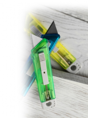 Transparentní plastový řezák s bezpečnostním mechanismem. Rozměry: 12,4 × 2,4 × 1,4 cm.