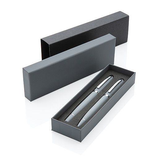 Elegantní sada kuličkového pera a rolleru s matným povrchem příjemným na dotek. Obsahují německou modrou náplň Dokumental® pro zhruba 1 200 m textu u pera a 400 m u rolleru. Dodáváno v dárkové krabičce. Rozměry: 2,6 × 5,6 × 17,7 cm.