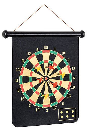 Společenská hra šipky v podobě oboustranného magnetického terče. Na jedné straně tradiční terč na šipky, na druhé straně terč Bulls eye. Obsahuje 6 šipek. Rozměry: 35 × 45 cm.