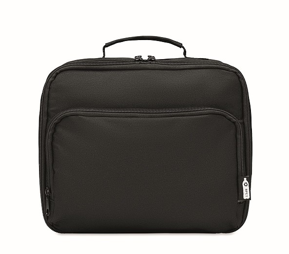 Chladicí termotaška z 600D RPET, s rukojetí a 2 mm podšívkou z hliníkové fólie. Rozměry: 25 × 10 × 21 cm.