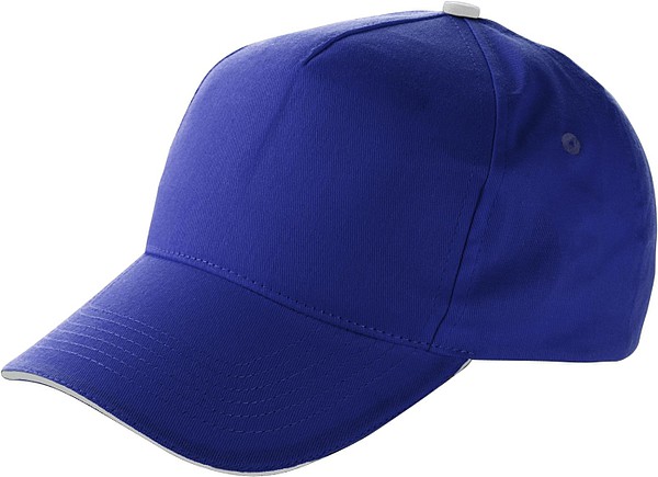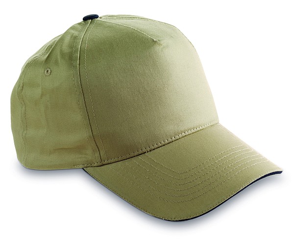 Pětipanelová bavlněná čepice se sendvičovým kšiltem a zapínáním na suchý zip. Materiál 100% bavlna. Rozměry: O 19 × 13 cm.